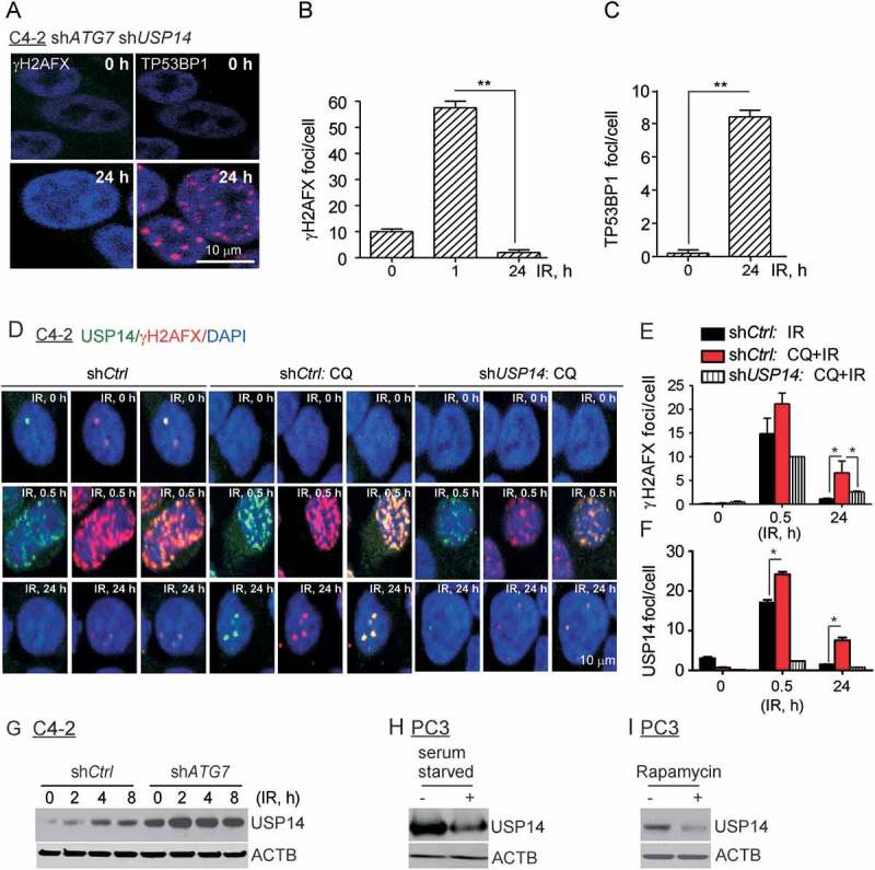 IR治疗可以激活许多肿瘤自噬,而组蛋白H2A和H2AFX/H2AX响应的DNA DSBs泛素化是一种关键的翻译后修饰,具有介导下游信号传导,DNA修复因子募集的作用。因此,作者认为泛素化和去泛素化信号可以有效动态调节DDR。