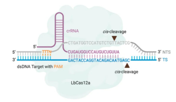 作用机制:Cas12a作为一种2类核酸酶,可在crRNA的引导下找到PAM序列为TTTN的靶标位点,通过crRNA与靶标链的互补配对,实现对靶标双链DNA的特异性结合,再通过RuvC亚基切割双链DNA产生黏性末端,最后通过体内的DNA修复途径完成DNA的插入和删除等,从而进行gene编辑。