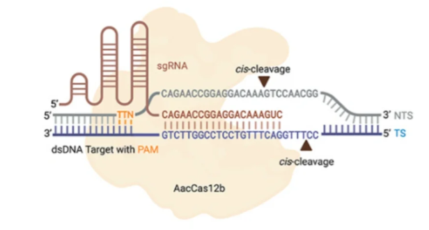作用机制:与Cas12a不同,Cas12b蛋白需要crRNA和tracrRNA组合为SgRNA,在SgRNA的引导下特异性识别靶标单链DNA(SSDNA)或带PAM(TTN)序列靶标双链DNA(dSDNA),并对靶序列进行特异性切割,使dsDNA断裂并生成粘性末端。