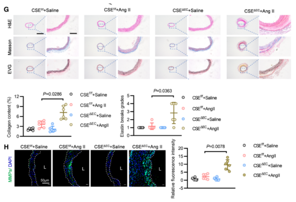 然后,如图4A,研究者使用EC增强的过表达CSE的腺相关病毒(AAVendoCSE)来增加ApoE−/−小鼠内皮中的CSE水平。用含有GFP的AAV载体(AAVendoEV)作为对照,可以从图4B、C中看到,在含有GFP的AAV载体(AAVendoEV)小鼠中,Ang II治疗可诱导AAAs或致死性AoD,而内皮中CSE的过表达可降低AAD的发生率。在图4G~H实验中,内皮中CSE的过表达抑制了主动脉内侧厚度的增加、弹性纤维的断裂、胶原的沉积和基质金属蛋白酶的活性。