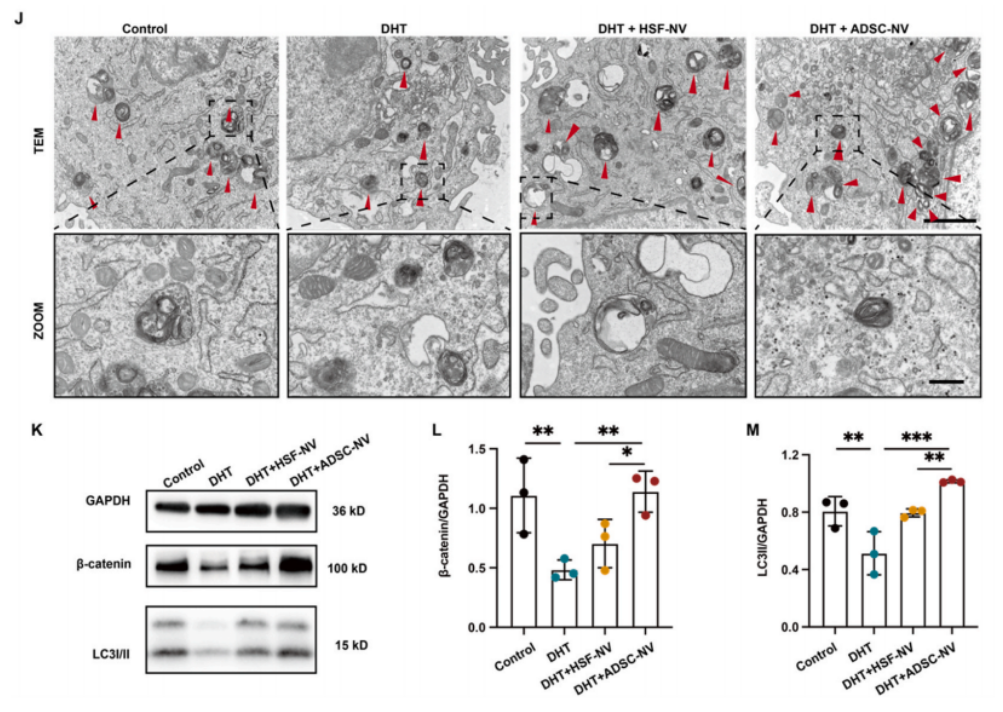 既往研究表明,ADSC外泌体可以刺激自噬,从而大大加速各种组织损伤的修复,并且ADSC外泌体具有通过Wnt/β-catenin途径刺激AGA HF再生的能力。因此,在图2J中,作者通过透射电镜明确ADSC-NVs促进了受损DPCs中更多自噬体的形成。此外,图2K~M结果表示,DHT损伤的DPCs中LC-3ІІ和β-catenin的表达显著降低,而ADSC-NVs明显消除DHT的抑制作用。这些结果表明,ADSC-NVs的功能类似于ADSC外泌体,激活自噬和Wnt/β-catenin通路,促进AGA毛发再生。